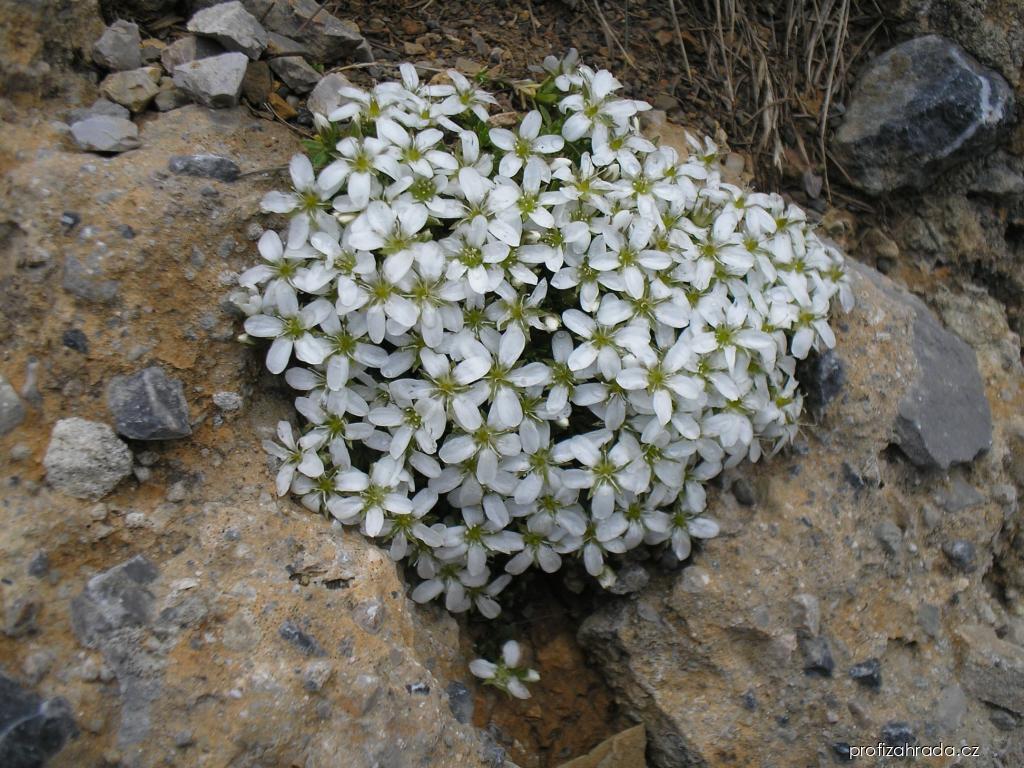 Písečnice - Arenaria ciliataČeleď: Caryophyllaceae - hvozdíkovité Barva květů: bílá, Typ květů: počet okvětních lístků 5, Místo: Rakousko | ||