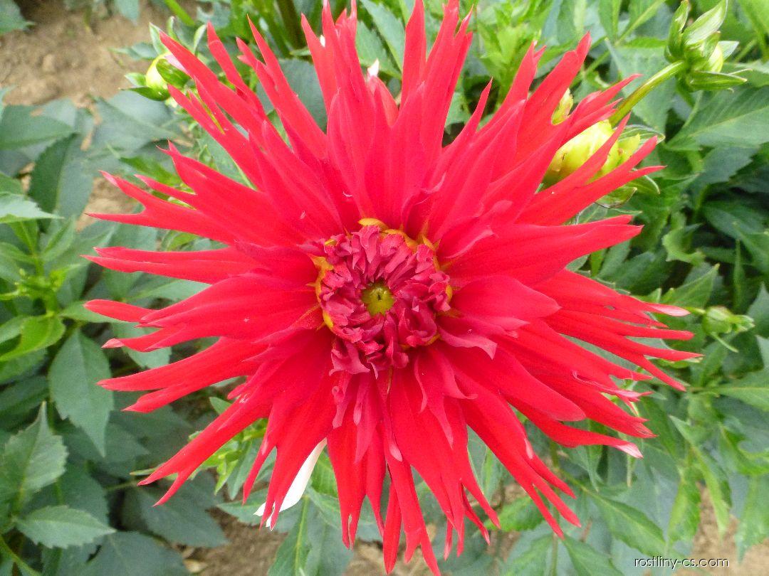 Kf- zářivě červená kaktusovitá fimbra, průměr úboru 15cm, výška rostliny 110cm, šířka 80cm, kvete poloraně ve 3 týdnu po ‘Kláře’, vhodná k řezu úborů, vyniká stálostí barvy úboru a odolností k uvolňování středu úboru.