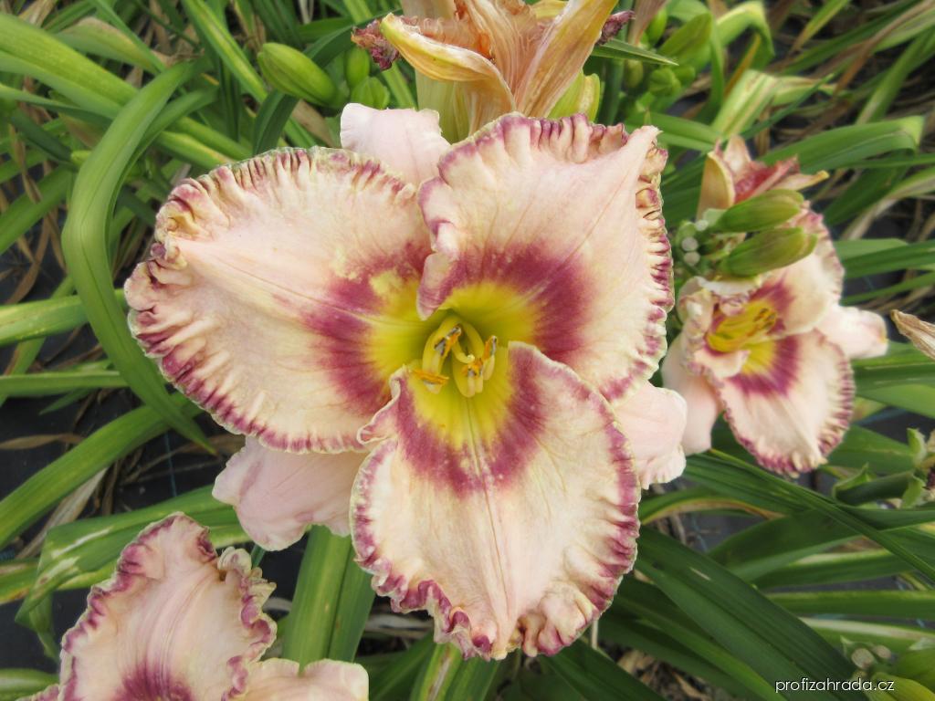 Denivka 'Here Lies Butch' - HemerocallisHemerocallis 'Here Lies Butch'; Čeleď: Xanthorrhoeaceae - žlutokapovité Barva květů: tmavě růžová, (květy jsou krémové až světle levandulové asi 14 cm velké a mají tmavě purpurový prstenec, hrdlo je zelené, okraje květů jsou silně vroubkované a fialové) Výška: 55 cm Šlechtitel: Agin 2010 | |
