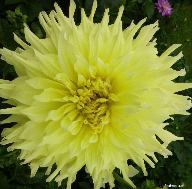 Jiřinka 'Herkules' - DahliaDahlia 'Herkules'; Čeleď: Asteraceae - hvězdnicovité Barva květů: žlutá, Velkokvětá semikaktusovitá jiřinka světle žluté barvy, průměr úboru 25cm, výška rostliny 120cm, šířka 90cm, kvete raně 1 týden po 'Kláře', vhodná pro sadovnické výsadby a zejména pro řez úborů. Zdroj: VÚKOZ Průhonice Místo: Dendrologická zahrada… |