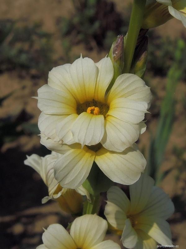 Badil žíhaný - Sisyrinchium striatumSynonyma: Bermudiana striata, Ferraria ochroleuca, Marica striata, Moraea sertula, Paneguia striata, Sisyrinchium libertioides, Sisyrinchium lutescens, Sisyrinchium reticulatum, Sisyrinchium sertiflorum, Sisyrinchium spicatum Čeleď: Iridaceae - kosatcovité Barva květů: bílá, žlutá, Typ květů: počet okvětních lístků 6. | |