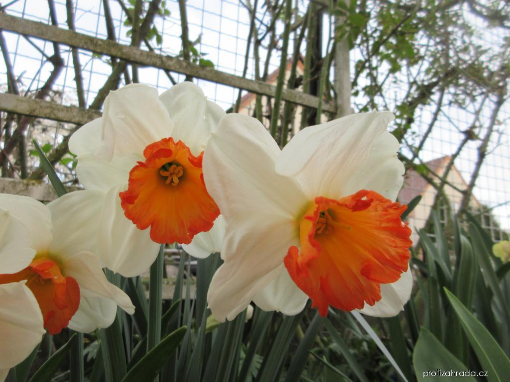 Narcis 'Over Easy' - NarcissusNarcissus 'Over Easy'; Čeleď: Amaryllidaceae - amarylkovité Barva květů: bílá, (Květy jsou velké a mají bílé okvětí a trychtýřovitou korunku, která je při bázi žlutě růžová, ve středech sytě růžová a při okrajích až tomatově červená, ke konci kvetení celá lososově červená.) Pochází z křížení 'Precedent'… |